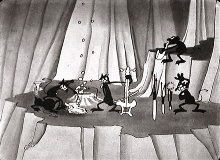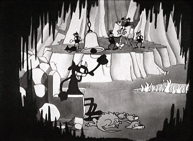 Hell's Bells is an unjustly overlooked short, amazingly unknown for a short as strange as it is. The animation is excellent, the visual gags funny and often truly surreal, and the film on the whole is on another planet. (Our favorite interlude is probably the Cubist dancing demon.) We only wish we could one day see this thing as it was intended: on the big screen.