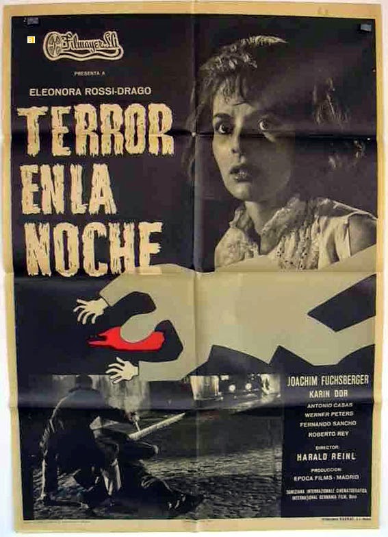 To loosely translate the plot as given at Remember It for Later: "On the very day that Margaret Lois Reedle (Brigitte Grothum of Wolfgang Schleif's psycho-thriller Der rote Rausch* [1962 / German trailer]) quits her job at the offices of the lawyer Shaddle (Fritz Rasp) for a position as the personal secretary of Countess Moron (Lil Dagover [30 Sept 1887 — 23 Jan 1980]), a mysterious (Klaus Kinski) first begins harassing her over the phone and then begins following up on his murderous threats. Only through the help of a stranger, Mike Dorn (Joachim Fuchsberger), does Margaret stay alive. A little later she learns to her horror that her mother was only her adoptive mother: her real mother is the convicted murderer Mary Pinder (Marianne Hoppe of Ten Little Indians [1965 / trailer]), who is due to be released from prison soon...."