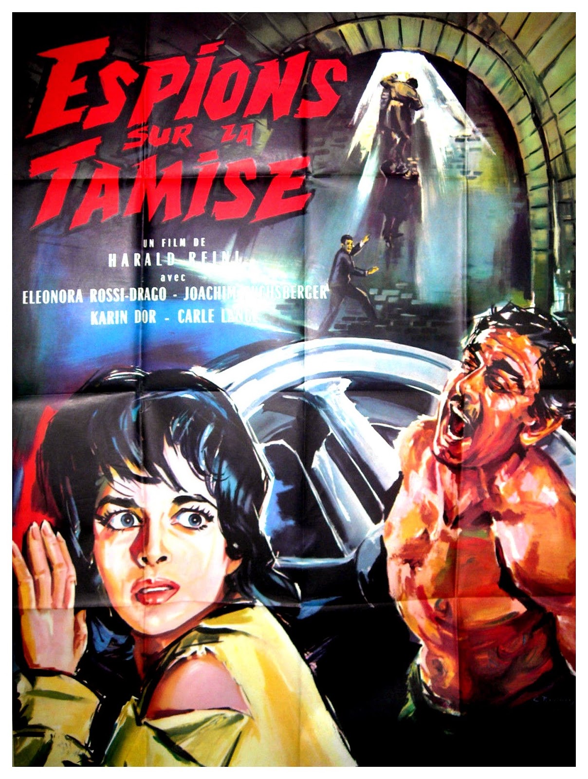The movie is based on Wallace's book The Indian Rubber Men, which had already been filmed in 1938 by Maurice Elvey as The Return of the Frog and sold as a sequel to the 1937 film The Frog, which, the astute among you might rightly conjecture, was an earlier version of The Fellowship of the Frog (1959). This version of the book, made as Das Gasthaus an der Themse, is a stand alone movie and has nothing to do with the 1959 flick starring Fuchsberger.To loosely translate the plot description at Das Filmlexicon: "A harmless whiskey smuggler is found dead on his boat, killed with a harpoon — the hallmark of the mysterious bad guy 'The Shark'! Scotland Yard faces a mystery. The Shark has been spreading fear and terror in the criminal underworld for a long time already, but he always escapes through the sewers of London. Inspector Wade (Joachim Fuchsberger) finally has a promising lead: the 'Mekka', an ominous port-side pub not far from the scene of the crime. The owner Mrs. Nelly Oaks (Elisabeth Flickenschildt) and her beautiful foster daughter Leila Smith (Brigitte Grothum) supposedly noticed nothing of the murder, but seem to know more. The situation comes to a head when Wade gets an unexpected visit in his office: he can't believe his eyes when the door opens — and the Shark is standing in front of him ... The film was shot completely in black and white; only the texts of the opening and closing credits are colored. Also, it is the first film that opens with the famous spoken phrase 'Hello! Edgar Wallace speaking'."