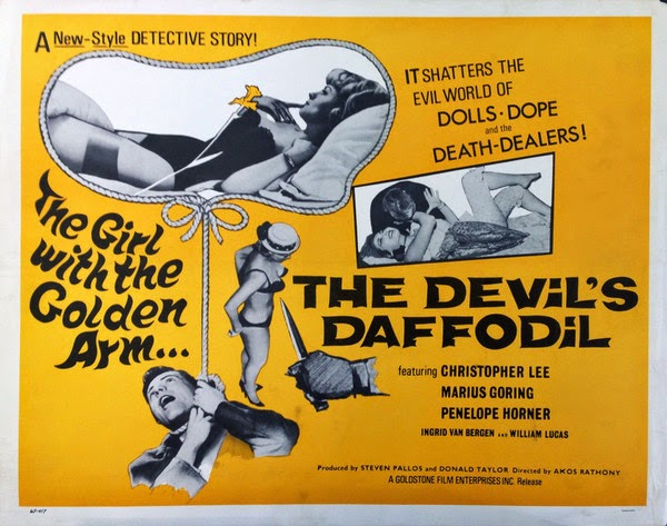 Like The Dead Eyes of London, we have seen this movie and have a review on the backburner for future publication. For now, however, we'll just preview the first paragraph: "Producer Horst Wendlandt made this film as a joint production with the British production firm Omnia in London. As a result, aside from the extraordinary amount of exterior scenes for a Wallace film (which usually tend to be studio bound), two versions of the movie were filmed simultaneously, one in English and the other in German. Although both versions utilized the same crew and most of the same secondary and background actors, the lead roles were filled by different actors, depending on the language. In the English-language version, entitled The Devil's Daffodil, William Lucas (of Tower of Evil [1972 / trailer, starring Jill Haworth] and Shadow of the Cat [1961 / full movie]) starred as Jack Tarling instead of Joachim Fuchsburger, Penelope Horner (of Inferno 2000 [1977 / trailer] and Dracula [1974 / trailer]) was Anne Rider instead of Sabine Sesselman and, unbelievably enough, Klaus Kinski was replaced by Colin Jeavons (of Frankenstein Created Woman [1967 / trailer] and Schizo [1976 / movie]) as Peter Keene. In truth, however, no matter which version of the movie one sees, Akos Ràthonyi's unbelievably lifeless direction remains the same. Thus, of course, the final cinematic experience also remains the same: Das Geheimnis der gelben Narzissen is a dull sleeping pill, a snoozer that in no way requires re-evaluation, rediscovery or even your attention when nothing else is on the tube." (Didn't stop the movie from being a hit when it was released, however.)Cave of the Living Dead: