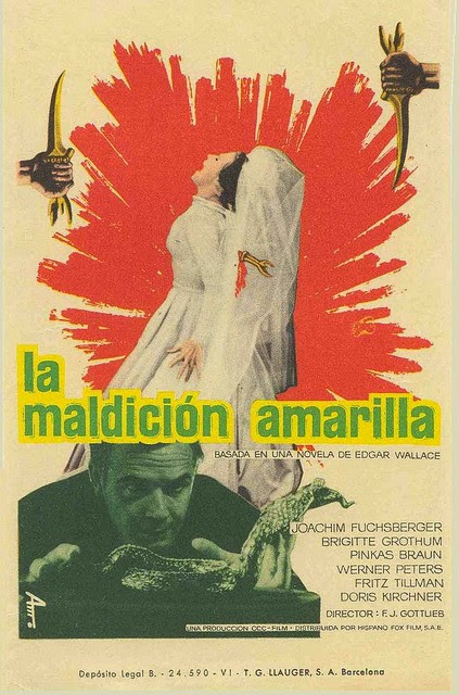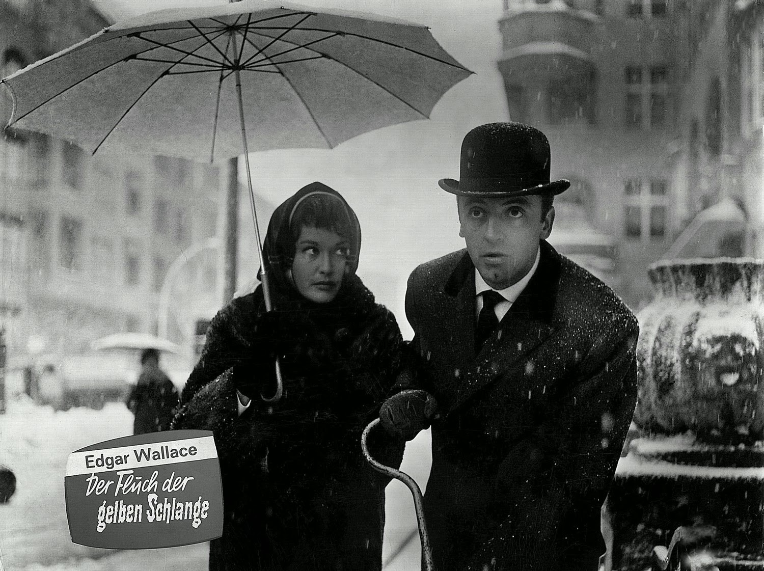 Der Fluch der gelben Schlange, the 13th of the German Wallace series, was the first of three Wallace films Franz Josef Gottlieb (1 Nov 1930 — 23 July 2006) was to make, none of which qualify as the best of the series, though his second, Der schwarze Abt aka The Black Abbot, also from 1963, is far more successful than this racist-tinged, imitation Fu Man Chu adventure movie. Like the interesting but badly flawed and racist Kurt Ulrich-produced Wallace film Die Racher aka The Avenger (1960 / German trailer), Der Fluch der gelben Schlange is not a Rialto production; here, Artur Brauner's production company CCC-Film was behind the film (his only other Wallace production is Jess Franco's Der Teufel kam aus Akasava (1971 / trailer). Due to the legalities of the agreement with the distribution firm Constantine Films, which also distributed the Rialto Wallaces, The Curse of the Yellow Snake even opens with the famous "Hier spricht Edgar Wallace" opening intonation.