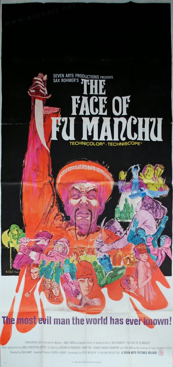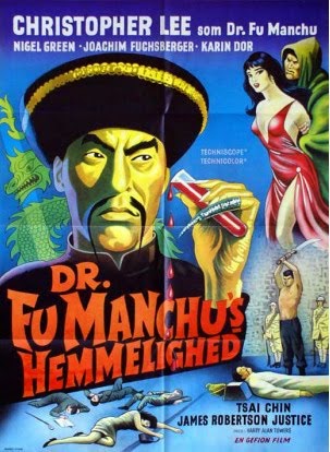 We took a quick look at the movie in our R.I.P. Career Review of Don Sharp, the director, where we wrote: "[...] When Harry Alan Towers joined the German production company Constantin Film to create a new franchise of thrillers ala the popular Dr Mabuse and Edgar Wallace films, Sharp was pulled in to direct the first of what ended up being five Fu Manchu films. (Sharp only directed this and the first follow up film, The Brides of Fu Manchu (1966 / trailer), but the headlining star Christopher Lee appeared as Fu Manchu in all the films; Fu Manchu is second only to Dracula as the film character he played most often.) For the West German version, the German actors — the ever-popular Joachim Fuchsberger and Karin Dor — received top-billing alongside Lee, though Fu Manchu's constant nemesis Nayland Smith was actually played by Nigel Green (The Masque of the Red Death [1964 / trailer]). The plot, as supplied by Jeremy Perkins at imdb: "Grisly strangulations in London alert Nayland Smith of Scotland Yard to the possibility that fiendish Fu Manchu may not after all be dead, even though Smith witnessed his execution. A killer spray made from Tibetan berries seems to be involved and clues keep leading back to the Thames."It is perhaps worth noting that the great Jess Franco directed the last two films of the series, The Blood of Fu Manchu (1968 / trailer) and The Castle of Fu Manchu (1969 / trailer); the terrible critical and box office response to the final film torpedoed the 6th movie in planning.