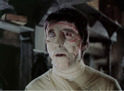 The Curse of Frankenstein opens with the young, orphaned Baron (Melvyn Hayes) primly dong his prescribed duties in regard to the burial of his deceased mother. That out of the way, he promptly hires Paul Krempe (Urquhart) as his tutor. Jump start ahead, the Baron is not only (as mentioned before) an adult suddenly much older than his tutor, but he is the owner of a full-blown mad-scientists lab in which he and his tutor-turned-assistant carry out all sorts of experiments in the name of science. Starting with the revival of a dead dog, they quickly move on to stitching together a humanoid creature from body parts collected and stolen (some, like the hands, under the most questionable of circumstances). Elizabeth (Court) shows up to take her promised matrimonial place at the side of the Baron just around the time when the moralistic Krempe opts out of further assisting the Baron to instead hang around making declarations of future doom. The Baron kills for a brain which in turn Krempe damages, but there is no stopping the driven, ruthless mad scientist. The Creature (Lee) is a pathetic mess, an out-of-whack piece of reanimated body parts that does little more than kill and destroy; despite its obvious faults, the Baron revives it a second time after its initial death. Finally, after it is destroyed in that handy vat of acid every turn of the century scientist seems to have had in his lab, the Baron is held responsible for the creature's murders and must face the hangman alone, deserted by both Krempe and Elizabeth… Of course, as everyone knows who has seen the less-visceral and almost as equally entertaining sequel, the Baron does not lose his head as planned.