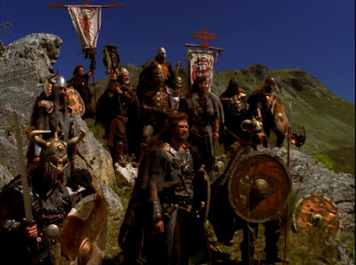 Barek, by the way, is the Viking son of Thorsson and, in turn, the brother of Boar (Craig Sheffer). The latter, after being bitten by the vampire valkyrie Brunhilda, runs off to join the Berserkers when Barek steals Brunhilda, whom Boar sees as his gal. Daddy Thorsson, however, needs the help of the Berserkers to ensure his thrown, but after the Berserkers keep their end of the deal struck, he proves untrustworthy. This angers the god Odin, and he revenges himself by making the movie fall completely and confusingly apart. Were it not for the plot description of the movie we found at the Peakviewing Transatlantic website, we would've been hard placed to explain the how and why of the movie's entire second half, which takes place in contemporary times.