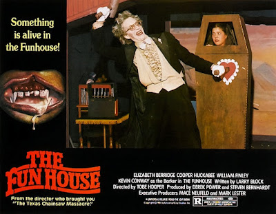 The plot, at Letterboxed, among other places, of a movie that Film School Rejects says "doesn't seem to get the same kind of love and affection despite deserving it": "Rebellious teen Amy (Elizabeth Berridge) defies her parents by going to a trashy carnival that has pulled into town. In tow are her boyfriend, Buzz (Cooper Huckabee of The Curse [1987] & The Unknown [2005 / trailer]), and their friends Liz (Largo Woodruff) and Richie (Miles Chapin of Howard the Duck [1986 / trailer] & Pandemonium [1982 / trailer]). Thinking it would be fun to spend the night in the campy 'Funhouse' horror ride, the teens witness a murder by a deformed worker wearing a mask. Locked in, Amy and her friends must evade the murderous carnival workers and escape before it leaves town the next day."