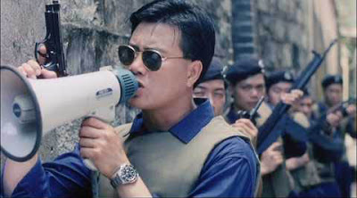 Indeed, one of the biggest unintentional laughs of the movie is when the prissy but capable police boss Tsang (Alex Man) bawls his eyes out over the death of one character whom, to that point, one figured to be the main female: but up till then, who would have thought he cared? Also, how Chun Bing (Moon Lee) keeps revealing where her dad is, and to whom she does it, makes even less sense than how she then always prevents that given person from taking her dad in. And what a dad he is! He's oh so concerned about his other daughter, but would rather keep his diamonds than to stop her from being raped and tortured (and, one assumes, killed). And then, finally, at a drop of a hat Chun Bing (Lee) and Yuet (Lui) are permitted by the prissy police chief to team up with Tong Fung (Hu) for an armed, three-person special mission taking on Chiu Shing (Ng) and his armed army in a deserted house.