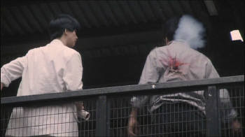 But in the film, he doesn't do that and instead blows up the house — and the last scene is of how Bing (Lee), Yuet (Lui) and Fung (Hu) jump out of the house, not only engulfed in flames but actually on fire themselves due to a real-life technical fuckup. Lui came away relatively unharmed, but both Lee and Hu suffered serious third-degree burns and had to be hospitalized. Hu and Lee eventually recovered, and the film accident became legendary; it is even exploited at the films end, with a written epilogue telling the details of the accident and commending the actors for their work and courage.