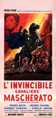 TCMhas the plot: "During a plague in 17th-century Higuera the despotic Don Luis (Daniele Vargas of Lo zombo, tu zombi, lei zomba (1979 / Italian trailer]) sequesters himself and his minions in his castle. A masked cavalier, however, penetrates this sanctuary and quickly dispatches the don's henchmen. His appearance coincides with the arrival of the tyrant's stepson, the timid Diego (Pierre Brice), whom the despot betroths to Carmencita (Hélène Chanel), orphaned daughter of the former governor. Having gained entrance to a feast celebrating the epidemic's end, the masked swordsman kills the don during a duel. Shedding his guises of masked intruder and stepson, the cavalier reveals himself to be a Spanish officer, Captain Naderos, and he proclaims his love for Carmencita."