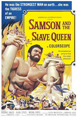 Muscleman Alan Steel (7 Sept 1931 – 5 Sept 2015), Steve Reeve's former stunt double, was born Sergio Ciani in Italy. That's him above with costar Moira Orfei (21 Dec 1931 – 15 Nov 2015), image taken from the fun blogspot Peplum. Dunno why, but when we were wee lads he never made our hearts go pitter-patter the same way as Steve Reeves did.The trailer