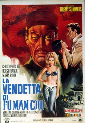 Towers' young wife, Maria Rohm, finally gets a larger part (but no name on the poster) in this adaptation of a Sax Rohmer (15 Feb 1883 – 1 June 1959) novel. Rohmer, born Arthur Henry Sarsfield Ward, was one of the most successful and well-paid English-language authors of 1920s and 30s, his success built upon his famous personification of the decidedly non-racist (NOT!) concept of the "the Yellow Peril", Dr. Fu-Manchu, whom he introduced to the world in 1913 with the novel, The Mystery of Dr. Fu-Manchu.