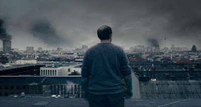 No phone, no food, and — as the television goes from news reports to the emergency broadcast system, and the radio broadcasts become little more than a looped tape — no hope. Trapped in a situation as bleak as late-fall Berlin is grey and dank, remaining "safe inside" means death by hunger. And as Murphy's Law in omnipotent, any step Michael and Harper take seems only to make their "safe space" smaller and more unsafe. Including the event involving the homemade battering ram — or "Rammbock"— that bestows the film its German title. (An arbitrary title decision, actually: they could have just as well titled the movie "Camera Flash" in reference to the movie's one new tweak in the zombie canon: the grey eyes of the infected are also extremely photosensitive.)