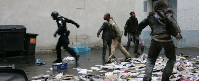 While not exactly ignoring the "undead" hoards and chomp-chomp deaths expected of a zombie movie, Rammbock has higher aims than just offering a bloody bodycount and the living vs. "undead". The interest of the filmmakers lies far more in the human side of the story of a variety of people, but primarily the two leads, Michael (Michael Fuith) and Harper (Theo Trebs), suddenly caught in a claustrophobic setting as the world collapses. (The people are for the most part caught in a typical Berlin Hinterhof— tenement back courtyard — while Michael and Harper are stuck in a Hinterhofflat.) And while the small cast of people do different things at different times in response to the danger confronting them, not one becomes the efficient (and in the end unbelievable) zombie-killing machines so common of too many contemporary zombie movies. In this sense, Rammbock— despite being populated with amped-up, fleet-footed zombies — is more closely related to the original Night of the Living Dead(1968 / trailer) than, say, the average Asylum zombie flick or certain currently popular television series. The people populating this flick are normal Joes and Janes, not wannabe, pistol-packing, acrobatic deadshots or secret samurais. And in an almost stereotypical manner, considering Germany's waning reputation as a technology leader, the solutions they come upon are based on technology, both primitive (battering ram) and modern (flashing luminaries).