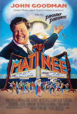 Mondo Digital, which says that "this love letter to the golden era of kid's horror and sci-fi matinee movies from the mid-'50s through the early '60s is perhaps the warmest film directed by Joe Dante", has the plot: "As the Cuban Missile Crisis looms in 1962 and atomic fears are at their height, gimmick-hawking movie director and producer Lawrence Woolsey (John Goodman of Fallen [1998 / trailer]) descends upon a military-heavy neighborhood in Key West to hawk his latest masterpiece: Mant!, the story of a dental X-ray mishap that turns an innocent man named Bill into a mutated monster with a taste for sugar cubes. Accompanying Woolsey is his leading lady and partner in promotion, Ruth (Cathy Moriarty of But I'm a Cheerleader [1999 / trailer]), who's getting a bit jaded with a life of nonstop showmanship. Among the fans eager to see the film are high schooler Gene (Simon Fenton) and his younger brother, Dennis (Jesse Lee), whose Army dad has just moved them into the area. Gene has a crush on Sandra (Lisa Jakub) and uses the opportunity to help Woolsey with the big premiere as a chance for a double date with friends Stanley (Omri Katz of Hocus Pocus [1993 / trailer]) and Sherry (Kellie Martin), but a jealous leather-clad rival*, a concerned citizen's group with a big secret, and a twitchy theater manager ensure the big day will be more explosive than originally planned."*Named "Harvey Starkweather"— one of Dante's darker in-joke references to the general period in which Matinee is set. In this case, a reference to the infamous serial killer Charles Starkweather (24 Nov 1938 – 25 June 1959), who (among many films) inspired the low budget masterpiece The Sadist (1963). Warmer nomenclatural references, among the many in the movie, include Dick Miller's character Herb Denning (seen above), named after the actor Richard Denning (27 March 1914 – 11 Oct 1998), with whom Miller actually worked in The Oklahoma Woman (1956 — see Part I) and Naked Paradise (1957 — see Part I), and Cathy Moriarty's Ruth Corday, who is named after Mara Corday (see: Trailers of Promise – Films We Haven't Seen: The Giant Claw [1957]). The whole film, of course, is loosely inspired by the great independent showman cum filmmaker, William Castle.