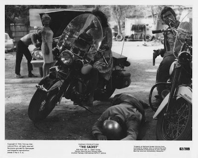 ** We haven't been able to find a definitive list of all films that came from the house of Fairway Productions, but the firm produced a number of fun films. Their first film seems to have been the nudie-cutie Magic Spectacles (1961, dir. Bob Wehling), which Arch Hall Jr. supposedly scripted. Aside from The Sadist, the titles featuring Hall Jr as an actor are The Choppers (1961 / full movie), Eegah (1962), Wild Guitar (1962 / full movie / trailer), The Nasty Rabbit (1964 / full movie) and Deadwood '76 (1965 / full movie). Known productions without Hall Jr are Tell It Like It Is aka The Weird Ones (1971), Ray Dennis Steckler's The Thrill Killers (1964 / trailer) and What's Up Front! (1964).