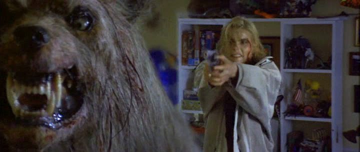 As in Wayne Smith's book Thor, the real hero of Bad Moon is neither human nor werewolf, but rather the German Shepherd of single mom Janet Harrison (Mariel Hemingway of Into the Badlands [1991 / trailer] and Lipstick [1976 / disco down]) and her son Brett (Mason Gamble). Into their life returns Janet's brother Ted (Michael Paré of Village of the Damned [1995] and Blood Rayne: The Third Reich [2010]), a photographer last on assignment with his girlfriend Marjorie (Johanna Lebovitz) somewhere in Nepal. Unbeknownst to Janet, but as the viewer knows due to the earlier well-staged, tension-building opening sequence of major coitus interruptus in Nepal, Marjorie was bloodily torn to pieces by a werewolf and Ted infected by its bite before he could blow its head away with a shotgun (silver bullets be damned here).