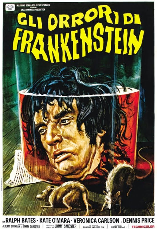 We already took a look at this flick in our R.I.P. career review of Jimmy Sangster. To simply re-use what we wrote there: "The Horror of Frankenstein, Hammer's 6th Frankenstein film, is a stand-alone film that occurs outside of the Peter Cushing films. Often dissed as the worst in the Hammer series, it is also Sangster's directorial debut, a reworking of the script he supplied for the first film of the series, The Curse of Frankenstein (1957 / trailer), revamped for a younger audience. Contrary to popular opinion, the humor, like all the sex, is intentional. The plot as told at Popcorn Pictures: 'Victor Frankenstein (Ralph Bates) is angry when his father forbids him from going to study at college to continue his anatomical experiments. So kills his father and makes it look like accident, thus leaving Victor with the family fortune and title of Baron. He uses this wealth to finance his college studies but leaves when he gets the dean's daughter pregnant. Returning home, he sets up a laboratory and starts a series of experiments aimed at bringing the dead back to life with the intention of creating a human being from stolen body parts. Unfortunately his creature doesn't behave the way he intended it to.'The film, like all of Sangster's feature film directorial efforts, was less than a commercial success."