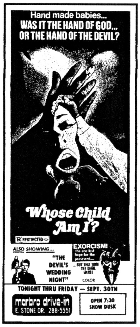 Temple of Schlock, which supplied the newspaper clips, offers another aka: "The British fertility clinic exploitation pic Whose Child Am I? — shot in 1974 as Who's Harriet? [...] — was submitted to the MPAA in February 1975 and began a regional roll-out from Brian Distribution later that year. With newspaper ads that made it look like a horror film, and co-billed with a real horror film (The Devil's Wedding Night [1973]), it opened at the Marbro Drive-In in Kingsport, TN on September 29, 1977. Over a year later — and no longer aimed at the horror crowd — it opened in the New York City area on a double bill with Embryo (trailer / full film) December 15, 1978."The Devil's Wedding Night: