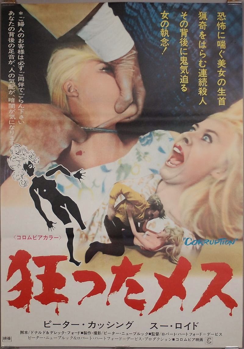 Kate O'Mara is the second lead and best-looking babe in this fabulously trashy piece of English sleaze horror featuring one wigged-out Peter Cushing. Our spoiler-heavy review of the film — hell, we tell everything that happens — can be found here. A former stage actor and director, Henry Levin, who entered the biz in 1943, had a long and prolific career in films: he had produced well over a movie a year by the time he died in 1980 while shooting the TV movie Scout's Honor (1980). Among his many movies are Cry of the Werewolf (1944 / full movie), the second movie to ever feature a female werewolf; two Matt Helm flicks, Murderers' Row (1966 / trailer) and The Ambushers (1967 / trailer); and the fabulous guilty pleasure Kiss the Girls and Make Them Die (1966).