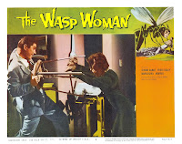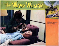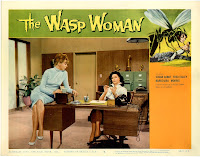 One thing you gotta say, Roger Corman always knew a good title when he saw one. So if a title as harmless as The Fly (1958 / trailer) brought in the crowds, surely something so much more monstrous like The Wasp Woman should do so, too. We're too young to know how The Wasp Woman did at the theatres when it first came out — though we do know it was at one point on a double bill with The Fly— but the title has proven itself unforgettable. Likewise, long before the film was honored with countless cheap public domain releases it was a regular on the Creature Feature shows of many a local broadcaster: we ourselves are sure we caught it as a child in both Massachusetts and Virginia, and like everything we saw back then, we loved it. Recently, we caught it again as an adult — regretfully, we must say that we were not quite as amused.